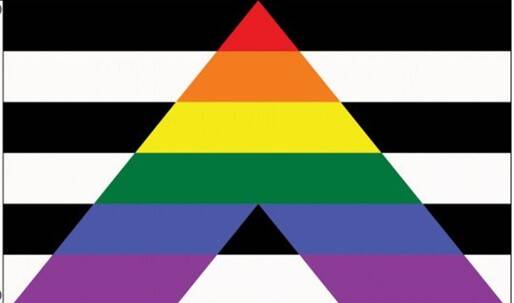 De zwart witte heterovlag, gecombineerd met de regenboog. Met deze vlag laat je weten dat je als hetero mens de Regenbooggemeenschap steunt
